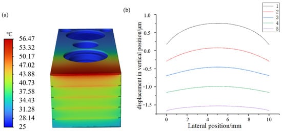 Semiconductor laser arrays are formed by stacking bars along the fast-axis direction with integrated microchannel heat sinks beneath each bar to mitigate thermal effects, where Figure 2 illustrates a typical five-bar configuration employing five independent microchannel heat sinks. Figure 3a reveals a maximum operational temperature of 56.47 °C localized at the uppermost bar—significantly exceeding optimal laser diode operating temperatures and approaching the upper reliability threshold, thereby compromising long-term operational stability—while a maximum thermal stress of 44.14 MPa concurrently occurs at this position. Subsequently, Figure 3b demonstrates thermally induced vertical displacement perpendicular to the PN junction across all chip layers, designated Chip 1 through Chip 5 from top to bottom, with the bottom-most laser chip exhibiting a maximum displacement of 1.67 μm.