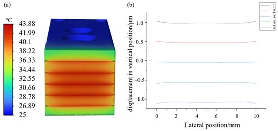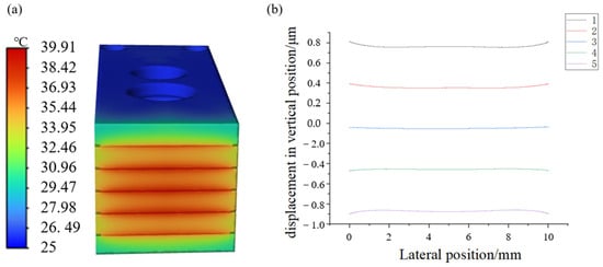 In a typical semiconductor laser array configuration, the topmost laser chip dissipates heat solely through a single MCC, while chips at other positions utilize both upper and lower MCCs to remove thermal energy from the bars. Consequently, the temperature rise, thermal stress, and vertical displacement of this top-layer chip exhibit the most pronounced effects. To address this, an additional structurally identical microchannel heat sink was integrated at the uppermost position, creating a symmetric MCC configuration to enhance thermal management capabilities. Figure 4a illustrates the temperature distribution in the symmetrically packaged laser array, revealing maximum thermal metrics at the central bar: a maximum temperature of 43.88 °C, a thermal resistance of 0.47 °C/W, and a maximum thermal stress of 25.35 MPa. Figure 4b displays the vertical displacement across chip layers in this symmetric configuration, with the maximum chip displacement measuring 1.12 μm.