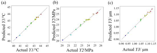 Comparison between actual values and predicted values in the response surface regression model. (a) Maximum temperature of the semiconductor laser stack array; (b) maximum thermal stress of the semiconductor laser stack array; (c) maximum vertical displacement of the chip.