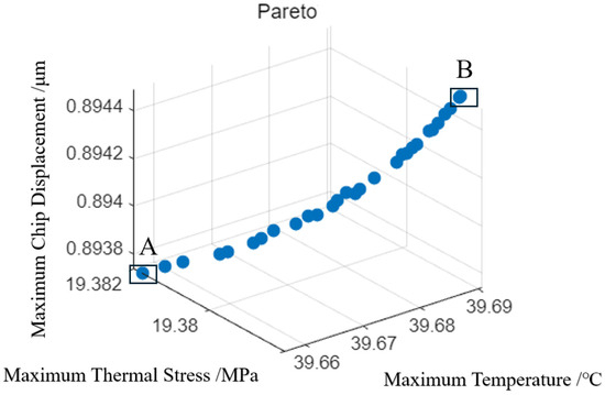 The mathematical formulation defines Y1, Y2, and Y3 as response surface models correlating design variables R, H, and B to the maximum temperature, maximum thermal stress, and maximum vertical chip displacement in the semiconductor laser array. The multi-objective genetic algorithm employed a population size of 100 evolved over 500 generations, with crossover probability fixed at 0.9. Adaptive mutation dynamically balanced global exploration and local exploitation, while retaining 30% of Pareto-optimal solutions. Figure 7 illustrates the uniformly distributed Pareto frontier after 500 generations, confirming algorithmic convergence. Point A corresponds to minimized temperature and vertical displacement, while Point B minimizes thermal stress. Considering the manufacturing difficulty of circular micro-pin fins and the small differences in temperature, thermal stress, and displacement between Points A and B, Point A was selected as the optimal solution. This configuration yields a predicted maximum temperature of 39.66 °C, maximum thermal stress of 19.38 MPa, and maximum vertical displacement of 0.89 μm. The corresponding micro-pin fin parameters are radius R = 0.1 mm, height H = 0.3 mm, and spacing B = 0.1 mm.