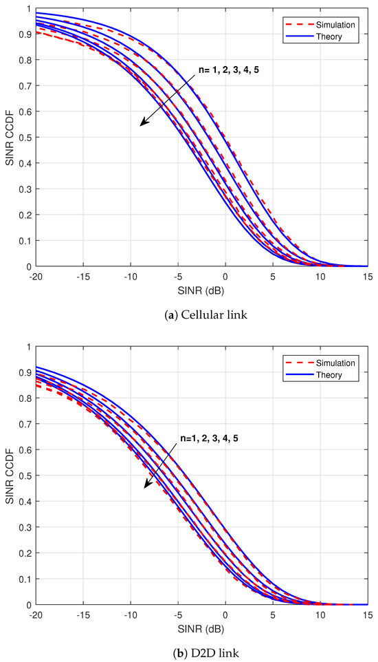 In the figures below, , and we considered a connection to n = 1–5 farther nodes. As we mentioned earlier, the relationship between the density of transmitting and receiving D2D nodes must be in accordance with the number of farther nodes that are investigated. If the ratio of transmitting D2D nodes to receiving D2D nodes is less than the number of farther nodes to be investigated, the assumption of independence between the DRUs’ PPP and the transmitting nodes is not valid. In other words, in this situation, DTUs form a correlated PPP with the receiving nodes, and considering other point processes for DTUs is necessary.