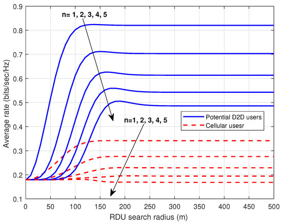 Furthermore, with the increase in , more DRUs choose the D2D mode to connect to the network. This increases traffic offloaded via D2D links; however, the interference from co-channel D2D links will increase. Similar to the results in [20], the increase in interference dominates the offloading gain, and therefore, the cellular rate will decrease with an increase in . However, in this paper, the density of receiving users is five times that of transmitting users. This causes the distance between DRUs and their neighboring DTUs to be relatively small for small values of n, although this distance increases with the increase in n.