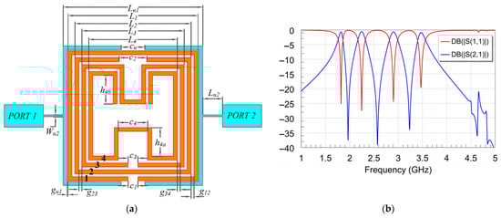 Quad-band bandpass filter: (a) Layout of the proposed filter with dimensions in mm: Lu1 = 14.2, Lu2 = 2, Wu2 = 0.2, L1 = 13.2, L2 = 11.8, L3 = 10.4, L4 = 9, cu = 2.4, c1 = 1, c2 = 2.8, c3 = 1, c4 = 3, gu1 = 0.1, and g12 = g23 = g34 = 0.3, h4a = h4b = 2.9, with (b) S-parameters of the proposed filter.