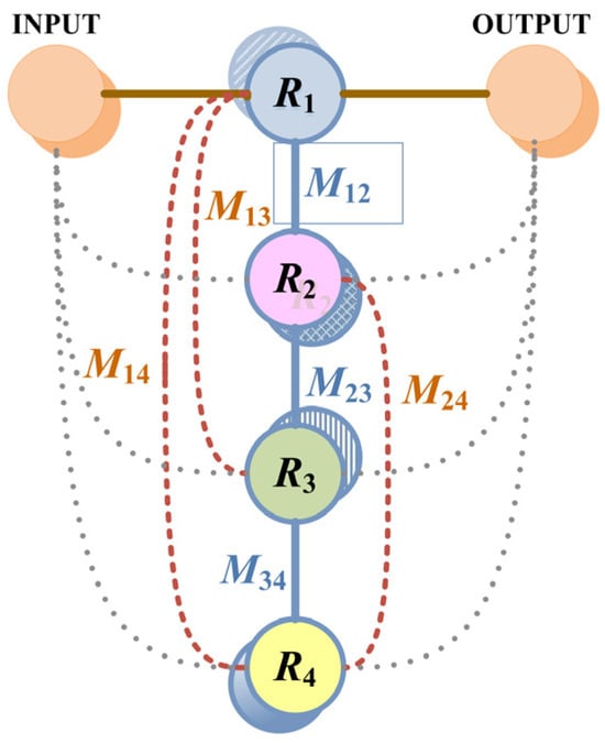 Adjacent couplings between resonators are denoted with M12, M23, and M34. Nonadjacent couplings, specifically M13, M14, and M24, are a consequence of the closely spaced resonators. The coupling coefficient between two asynchronously tuned resonators, labeled i and j, is calculated using the following []: