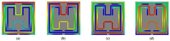 Surface current distribution of the filter resonators at the central frequencies of passbands: (a) the first passband at 1.82 GHz; (b) the second passband at 2.24 GHz; (c) the third passband at 2.90 GHz; and (d) the fourth at 3.47 GHz.