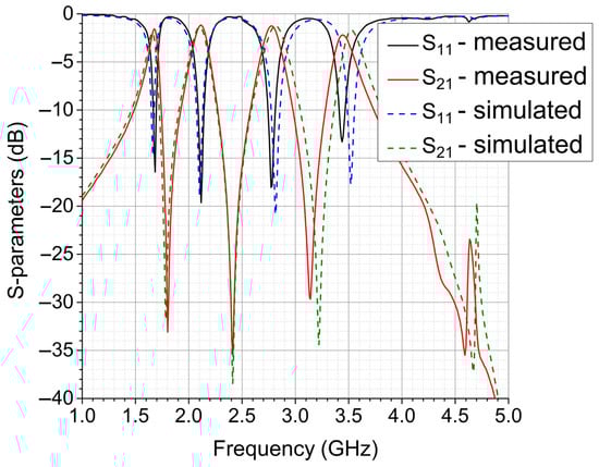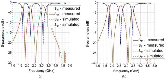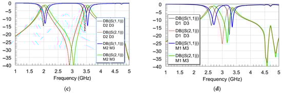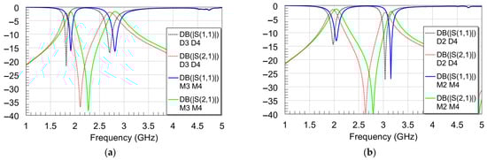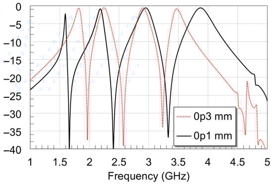 Adjacent passbands are separated by transmission zeros, which improve the selectivity of the proposed filter. In [], Geschke et al. explain how to extract the coupling coefficient between two SRRs using the de-embedding method. They present a set of de-embedding responses for two coupled SRRs, considering various distances between them. It can be seen that each response exhibits two resonances separated by a transmission zero, as one of the resonators functions as a rejection resonator. This means that the filter’s transmission zeros are positioned by resonators 2, 3, and 4, which function as rejection resonators. Furthermore, closely printed resonators lead to the appearance of nonadjacent coupling, which also affects the filter’s transmission zeros.
