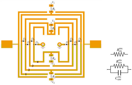 Layout of the quad-band reconfigurable filter with position of PIN diodes with their equivalent circuit model.