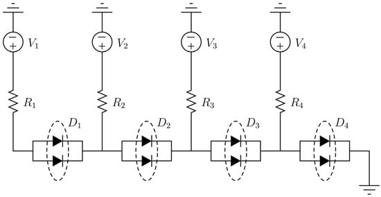 The layout of the realized reconfigurable quad-band filter with switches (PIN diodes) is shown in Figure 5. The DC bias circuit for the PIN diodes is shown in Figure 6. Switching off either one or multiple SRRs can be performed by grounding SRRs or by interconnecting adjacent SRRs to obtain one active resonator instead of two (see Figure 7). It can be seen from Figure 5 that the diodes D1, D2, and D3 interconnect two SRRs creating only one active SRR. The diodes D4 ground the inner SRR. In this way, the resonant frequency of certain SRR changes significantly and therefore it becomes nonfunctional in the filter structure.