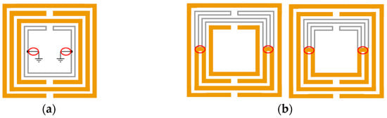 One or multiple SRRs can be switched off by the following: (a) grounding the inner ring, or (b) interconnecting adjacent rings to obtain a new one. Active rings are colored in orange, while the red circles represent the diode positions.