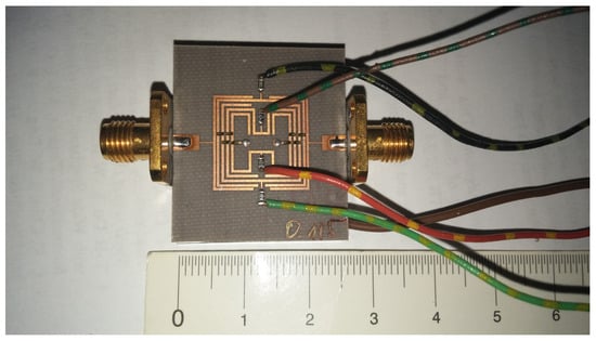 The fabricated prototype of the reconfigurable bandpass filter is shown in Figure 8. The filter is fabricated on Rogers DiClad 880 substrate with εr = 2.17, h = 0.762 mm, and t = 0.017 mm (see Section 2. Materials and Methods). PIN diodes are MACOM flip-chip diodes MADP-042905. Since the diodes are placed in such a way that they do not introduce additional insertion loss when they are in the ON state, we have been looking for diodes with the parasitic capacitance as low as possible. PIN diodes are simulated as a resistor in the ON state (RONPIN = 5 Ω) and as a parallel RC network in the OFF state (ROFFPIN = 50 kΩ, COFFPIN = 0.06 pF) (see Figure 5).