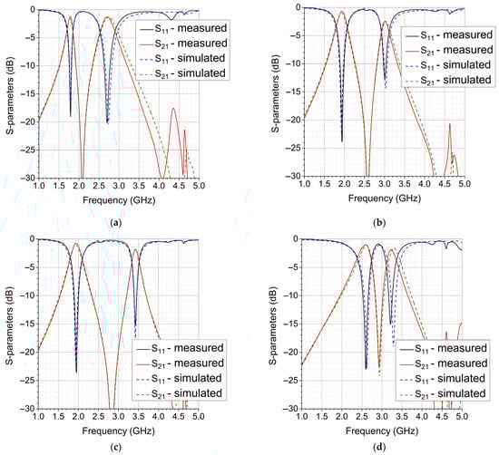 To verify the design procedure, we fabricated the filter prototype. Our prototype is remarkably compact, with overall dimensions of 0.2λg × 0.22λg (26 mm × 29 mm). Here, λg represents the guided wavelength of a 50 Ω microstrip transmission line at 1.68 GHz, which is the central frequency of the lowest passband. The SRRs themselves occupy a footprint area of only 14.2 mm × 14.2 mm. Fabricated using microstrip technology, this filter exhibits a maximum insertion loss of around 2.4 dB across all configurations. For the filter’s fabrication, we used commercially available PIN diodes as switching elements.