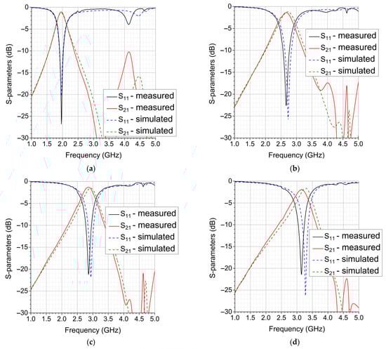 The simulated and measured S-parameters are presented in overlaid plots to show correlation clearly for each of eleven possible configurations shown in Figure 9, Figure 10, Figure 11 and Figure 12. Table 2 reports the filter performance based on measured results of a laboratory prototype. The quad-band configuration is obtained when all PIN diodes are OFF, and its response is presented in Figure 9.