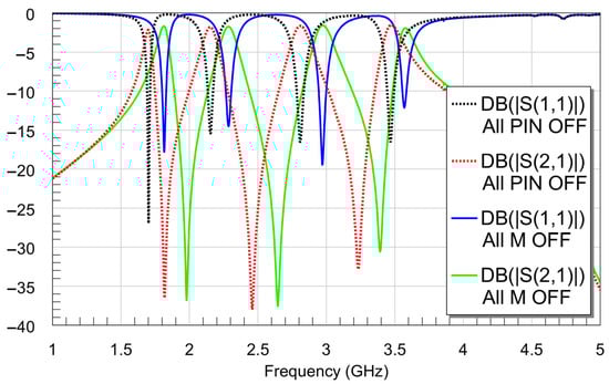 A simulation was realized for all eleven filter modes, and the results are presented in Figure 14, Figure 15, Figure 16 and Figure 17. For the PIN diodes, the most observable deviation is a shift in the passbands toward lower frequencies in the one quad-band, two triple-band, and four dual-band filter modes. This effect is consequence of relatively large capacitance of the PIN diode in the OFF state. Precisely, the OFF-state capacitance of the PIN diode (60 fF) is about 43 times greater than for the memristor (1.4 fF). The total increase in capacitance leads to a decrease in all central frequencies of the filter. This frequency shift might be compensated by reducing the length of the split-ring resonators.