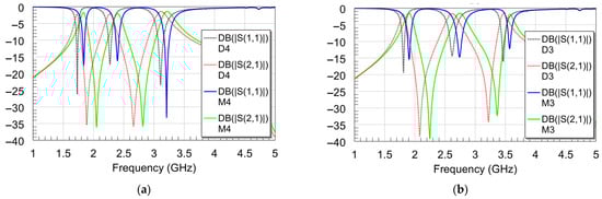 Triple-band configurations are realized in two cases when diodes D4 or diodes D3 are in the ON state (see the responses in Figure 10). When the inner ring is grounded (diodes D4 are ON), the first passband of the triple-band configuration almost overlaps with the first passband of the quad-band configuration (see Figure 10a). The third band is located at 3.11 GHz, approximately at the position of the third transmission zero of the quad-band configuration (3.2 GHz). The next topology, where D3 diodes interconnect the inner and the third rings, is shown in Figure 10b. The third passband of the triple-band configuration almost overlaps with the fourth passband of the quad-band configuration. Additionally, its first passband is positioned at 1.79 GHz, which is almost identical to the position of the first transmission zero (1.8 GHz) of the quad-band configuration.