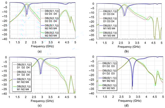 Dual-band filters: (a) Diodes D3 and D4 are ON; (b) diodes D2 and D4 are ON; (c) diodes D2 and D3 are ON; and (d) diodes D1 and D3 are ON.