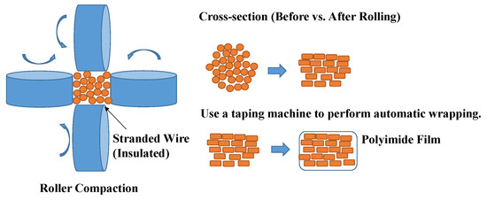 Rectangularization process of litz wire using high-compression rolling equipment.