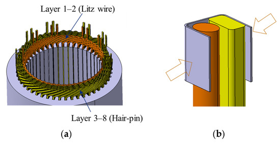 Here, δ is the skin depth, which decreases as frequency and magnetic field strength increase, especially near the air gap. The proximity effect coefficient kprox also increases with local AC magnetic field intensity Bac. In contrast, windings located farther from the air gap experience weaker magnetic fields, more uniform current distribution, and, thus, lower AC copper losses. These factors highlight the importance of minimizing AC losses in coils near the air gap, particularly in high-frequency or high-efficiency motor designs. Figure 3a illustrates the design concept of a hybrid winding using litz and rectangular wires. To mitigate the skin effect near the air gap, litz wire is utilized in the first and second coil layers, which are positioned closest to the air gap, where high-frequency magnetic fields are most concentrated. The remaining layers—third through eighth—are located farther from the air gap and are wound with rectangular conductors, as exemplified by the eight-layer winding configuration used in this study. The wire diameter is selected based on a trade-off between high-frequency skin depth, mechanical manufacturability, and slot fill factor. Smaller diameters reduce skin effect losses but may increase winding complexity. This selection process ensures both electromagnetic performance and manufacturing feasibility. While a higher fill factor enhances slot utilization and reduces DC resistance, excessive compaction of litz wire bundles may compromise mechanical integrity, leading to deformation, increased insertion difficulty, and potential structural failure during motor operation. To mitigate these risks, a practical trade-off was established through iterative prototyping and validation, ensuring an optimal balance between electromagnetic efficiency and mechanical robustness. This balance is critical for maintaining process reliability and ensuring long-term durability of the motor. Figure 3b shows the 3D structure of the stator. During the design process, the insertion and stacking sequence of the coils must be carefully considered. Additionally, to improve mass production feasibility, the number of solder joints between the litz wires and rectangular wires should be minimized. Additionally, during the soldering process, it is common for the fine strands of the litz wire to have weak bonding with the rectangular wire, which may lead to disconnection or detachment. To improve joint reliability, the assembly process can include (1) pressing the wires together to ensure close contact, (2) resistance welding as an alternative or supplement to soldering. In certain applications, a clamp-style (snap-fit) mechanical connection can also be considered to further enhance connection stability; however, when applied over polymer-coated litz wires, poor contact resistance may occur if insulation is not properly removed. For litz wires, insulation removal is more complex due to the individually coated fine strands. Industrial techniques such as laser stripping or chemical stripping are typically employed to ensure consistent exposure of bare copper before crimping or soldering, which helps secure low-resistance electrical contact. In future work, the impact of insulation removal techniques and crimping quality on contact resistance will be further evaluated.
