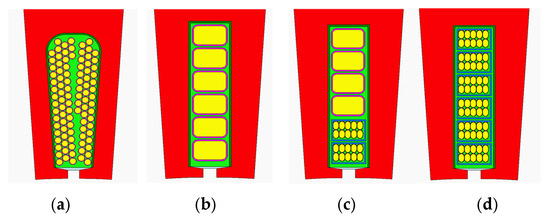 Stator slot and coil configurations of models 1–4. (a) Model 1: Pear-shaped slot with round wire winding (baseline design); (b) model 2: rectangular slot with rectangular wire winding; (c) model 3: rectangular slot with partial rectangular litz wire (Layer 1); (d) model 4: rectangular slot with full rectangular litz wire.