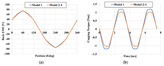 The line-to-line no-load back electromotive force (B-EMF) characteristics of the four models are shown in Figure 5a. And these value s were calculated using Equation (6).