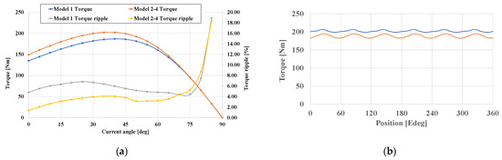 Consequently, similar to the no-load condition, the IPMSM’s core saturation under load operation is different for model 1 compared to models 2–4, while models 2 and 4 exhibit identical saturation levels (as shown in Figure 7). Therefore, the MTPA current angles of model 1 and models 2–4 are not the same. Moreover, the torque ripple is quantified by the torque ripple factor, which represents the ratio between the maximum fluctuation (peak-to-peak torque) and the mean torque output. This metric provides a standard way to evaluate the severity of torque variation. The mathematical definition is expressed as