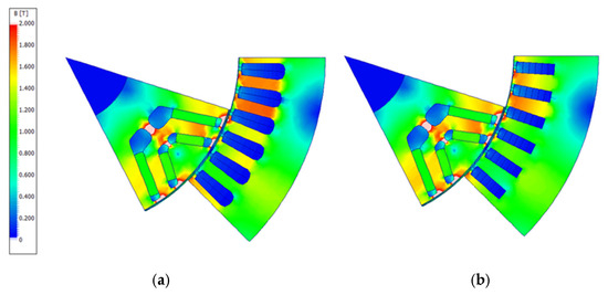 Cross-section and flux density distributions of four models in MPTA conditions. (a) Model 1, load condition (Ia: 200 Arms; β: 40°). (b) Models 2–4, load condition (Ia: 200 Arms; β: 38°).