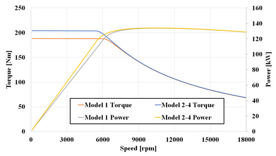 However, in the high-speed field-weakening and maximum torque per voltage (MTPV) control regions, all models exhibit similar torque behavior due to the overall decline in magnetic flux density in the stator core. Additionally, because the rotor structures are identical, the torque values at high speeds converge across all models. Therefore, at the base speed of around 5000 r/min, Model 1 delivers a power output of 98.6 kW, while Models 2–4 achieve 105.8 kW. However, across the full speed range, all models reach a maximum power of 134 kW, occurring near the 10,500 r/min range.
