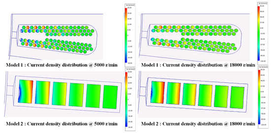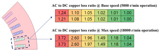 Figure 9 presents the current density for model 1 and model 2 at both base speed (5000 r/min) and maximum speed (18,000 r/min). It can be clearly observed that the current density at maximum speed is significantly higher than at base speed. Additionally, model 2 exhibits substantially higher skin effect and proximity effect losses compared to model 1, especially at high speeds, where the copper losses in model 2 are significantly greater than those in model 1. Furthermore, in both models, coil losses are notably higher near the air gap, with the current density in coils closer to the air gap being significantly higher than in coils farther from the air gap. Figure 10 illustrates the ratio of AC copper losses to DC copper losses in the coils of both slots (the motor has 48 slots and eight poles, with 2 slots per phase per pole). At higher speeds, AC losses, such as those caused by skin and proximity effects, become increasingly significant, leading to a higher AC-to-DC copper loss ratio. In contrast, under base speed conditions, these high-frequency effects are less dominant, and DC losses account for a larger proportion of the total copper loss. This explains the noticeable difference in the coil loss distribution patterns across the rows in Figure 10. Finally, it can be observed that the AC-to-DC copper loss ratio increases significantly in the coils closer to the air gap.