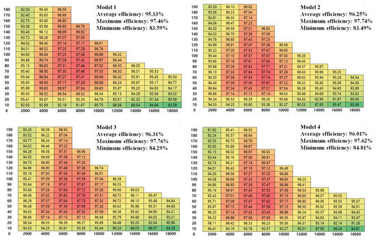 Efficiency maps of the four models under a DC voltage of 550 V and a motor temperature of 60 °C. Mechanical losses are not included.
