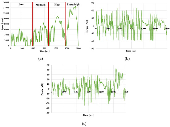 (a) Motor speed, (b) absolute load torque, and (c) power over the WLTP Class 3 driving cycle.