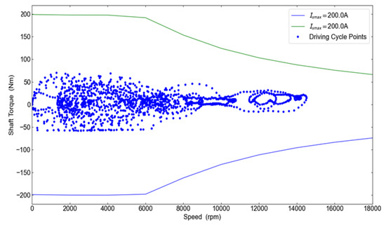 In addition, the selection of representative operating points was guided by WLTP cycle behavior and supported by the methodologies presented in [26,27], which emphasize statistical extraction and optimization of motor operating requirements based on real-world or standardized driving cycles.