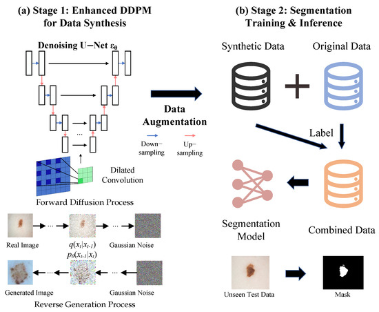 Our methodology is a synergistic two-stage framework engineered to address the concurrent challenges of data scarcity and morphological complexity in skin lesion segmentation. As illustrated in Figure 1, the framework consists of (1) a data synthesis stage, where we introduce an architecturally enhanced denoising diffusion probabilistic model (DDPM) to generate a diverse set of high-fidelity synthetic images, and (2) a segmentation stage, where a specialized U-Net variant leverages this augmented dataset for precise lesion delineation. The unifying principle of our framework is the strategic deployment of dilated convolutions in both stages, which expands the model’s receptive field to effectively capture the multi-scale features and ambiguous boundaries characteristic of skin lesions.