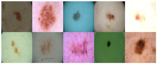 - Tschandl, P.; Rosendahl, C.; Kittler, H. The HAM10000 dataset, a large collection of multi-source dermatoscopic images of common pigmented skin lesions. Sci. Data 2018, 5, 1–9. [Google Scholar] [CrossRef]