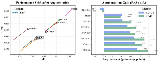 To demonstrate the broad applicability and model-agnostic benefits of our synthetic data generation strategy, we extended our augmentation approach to a diverse set of established segmentation architectures: Standard U-Net [7], Dilated-UNet (our U-Net variant with dilated convolutions, as described in Section 3.2.1), FCN-ResNet50, FCN-ResNet101 [38,39], DeepLabV3-ResNet50, DeepLabV3-ResNet101 [40], MEFP-Net [41], and ChimeraNet + LAMA [42]. Each architecture was trained with real data only (R) and real data augmented by synthetic images from our Enhanced DDPM (R+S). All models were trained under consistent hyperparameter settings for their families and evaluated on the test set. Performance metrics are presented in Table 3, with a visual summary in Figure 4.