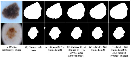 Qualitative comparison of segmentation results. (a) Original image, (b) ground-truth mask, (c) U-Net (R), (d) U-Net (R+S), (e) Dilated U-Net (R), (f) Dilated U-Net (R+S). Incorporating synthetic data (R+S) improves boundary sharpness and completeness, especially for ambiguous lesion regions.