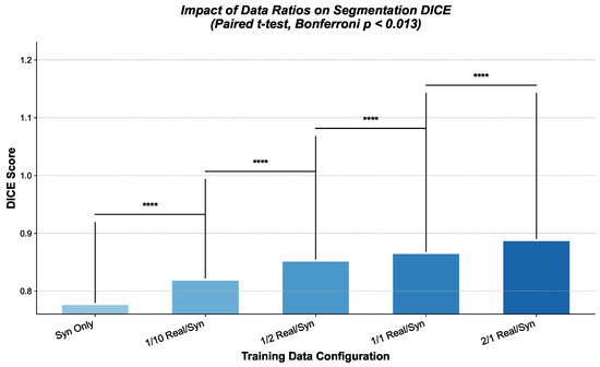 These comprehensive experiments demonstrate that incorporating synthetic data, particularly incorporated by the plot enhanced by DDPM with dilated convolutions, significantly improves the performance of the U-Net-based segmentation model. Statistical analysis using a t-test also highlights the contribution of the synthetic data to the final results in Figure 6. Our proposed framework mitigates the challenges of data scarcity in medical image analysis tasks. The solidity experiment across different real-to-synthetic data ratios further underscores how it optimizes this balance for specific applications.