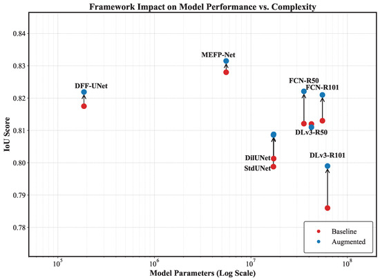 Framework impact on model performance vs. complexity. This scatter plot visualizes the trade-off between model performance (IoU score) and complexity (model parameters, on a log scale). Red points indicate the baseline performance of various segmentation models, while blue points show the performance after applying our data augmentation framework. The vertical arrows highlight the improvement in the IoU score. The chart demonstrates that our framework consistently boosts performance across different architectures, enabling smaller, more efficient models to match or exceed the performance of their larger counterparts. For the same amount of Dilated-UNet and standard U-Net, and a similar performance trained by R+S, the labels were set on the left side of the baseline point.