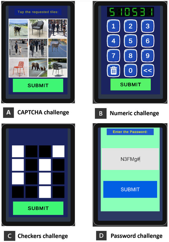 Overview of input panels for answering different challenge types: (A) CAPTCHA-style-selection of tiles to answer the requested challenge; (B) numeric input panel to enter a six-digit code; (C) checkers input panel for visual matching of two checkered grids; (D) six-character alphanumeric password submission dialog.