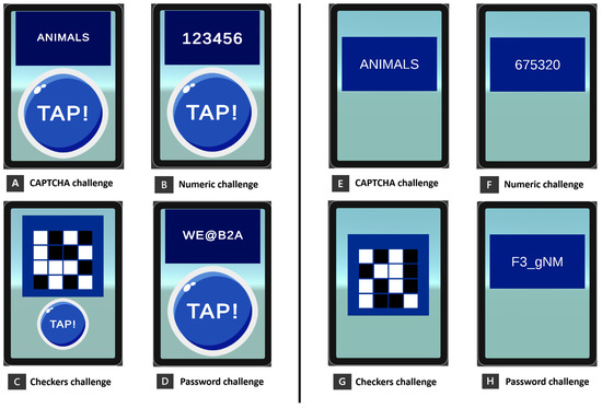 In the CAPTCHA challenge, the user is presented with a 3× 3 grid of images and must select three objects that match the description provided in the dialog showing the challenge request [1]. Only the challenge creator knows which items in the grid correspond to the correct answer. To implement this, the challenge creator sends a general description of the relevant icons to one device and the challenge grid to the second device used for authentication. For example, the user might be asked to select all three images containing animals on one device, as shown in Figure 2A,E, while the second device displays a grid with animals and other content, as shown in Figure 1A. There are three “themes” that can be fit into a 3× 3 set of tiles and users need to select three tiles to solve a challenge. Thus, users must complete two rounds of CAPTCHA challenges, requiring at least six clicks in total to solve the task.