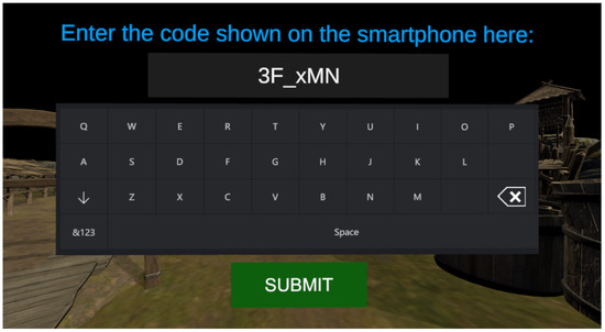 In this case the smartphone is used as the first device for authentication, that is, the device that shows the user the passcode with the expected response, i.e., the challenge to be solved (Figure 2, left panel), after which the HMD is used as the second device for the authentication, i.e., the device where the user enters and submits their solution to the challenge (Figure 8). The flowchart for this condition is shown in Figure 6B. Because the challenges can be solved within the VR environment with different input devices, users need a selection mechanism with which to either select tiles from grids, select digits on a virtual keypad, or select characters from virtual keyboards shown in the HMD. For the alphanumeric password, a virtual keyboard (as used by Boletsis et al. [68]) was presented to the users within the VR (shown in Figure 3). Head-based gaze selection using a clicker has been suggested as the most preferred method for gaze selection [67], and is the approach we used. Another possibility is the use of built-in eye trackers for selection [69]. However, most commercial VR HMDs do not provide built-in eye tracking capabilities. To allow users to submit their response while wearing the HMD, we used SmartVR pointer gaze-based selection (SVRP2), a method that allows for selection using head-based gaze selection in VR using the smartphone as a clicker to confirm selections [65]. Similar to Condition 1, this condition enables users to perform the whole authentication process relying solely on the VR HMD and their smartphone. A use case for this type of interaction is when a VR user is watching videos, browsing TV channels, or selecting a movie to watch by using their gaze for pointing and selection of their entertainment choice, then needs to confirm their identity to override a parental control. The system then generates a checkers-style challenge. The user can use their smartphone to solve the challenge shown in VR using gaze-based selection, after which they would have completed the whole process using only their HMD and smartphone.