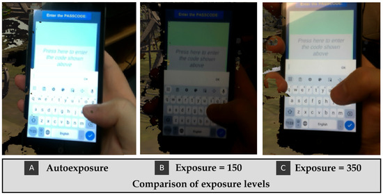 Exposure adjustments related to passthrough video capture: (A) illustrates how passthrough video with auto-exposure turned on often results in overexposure of the smartphone screen’s image; (A,B) show that too-high or too-low exposure levels cause the image to darken or brighten so much that it becomes nearly impossible to read its contents; (C) shows how appropriate adjustment of the exposure level allows users to discern the screen contents.