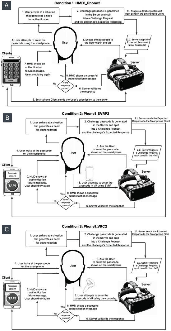 Flowcharts of key steps for two-factor authentication using NRXR-ID: (A) Condition 1: HMD1_Phone2; (B) Condition 2: Phone1_SVRP2; (C) Condition 3: Phone1_VRC2.