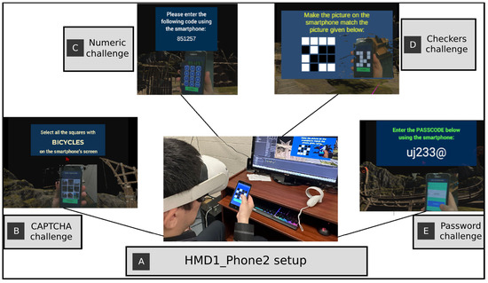 Overview of the authentication methods of Condition 1 (HMD1_Phone2). (A) Illustrates the experimental setup with a user holding the smartphone to complete the challenges. VR screenshots of request panels asking participants to solve a challenge using the smartphone app: (B) CAPTCHA challenge; (C) numeric challenge; (D) checkers challenge; (E) password challenge.