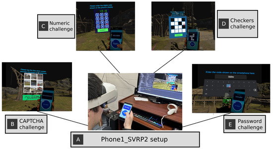 Overview of the authentication methods of Condition 3 (Phone1_VRC2). (A) Illustrates the experimental setup, with a user holding their smartphone to read the challenge or passcode shown on the smartphone. VR screenshots of challenges to be solved using the VR controller: (B) CAPTCHA challenge; (C) numeric challenge; (D) checkers challenge; (E) password challenge.