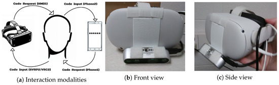 Figure 10a illustrates the two-way interaction involving the HMD, smartphone, and human operator. In different scenarios, the request for the code may be initiated by either the HMD or the smartphone, while the second device is used to input the code. Figure 10b,c shows front and side views of an experimental setup with the depth-sensing camera attached to the headset; the camera can be easily tilted to adjust the view angle for more convenient usage depending on user’s height, arm length, and preferred phone positioning.