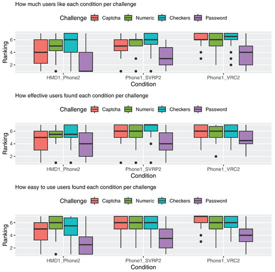 Additionally, when faced with the design choice of whether to use a gaze pointer or VR controller for selecting items within VR, our results suggest that the gaze pointer is the preferred option and performs slightly better (RQ4). With respect to the question of whether a phone should be used as the device showing the challenge (Phone1 conditions) or the device used to respond to the challenge (HMD1_Phone2 condition), our findings suggest that most people prefer to have the phone as the device showing the challenge (Phone1 conditions), with HMD then used for answering the challenge (RQ3).