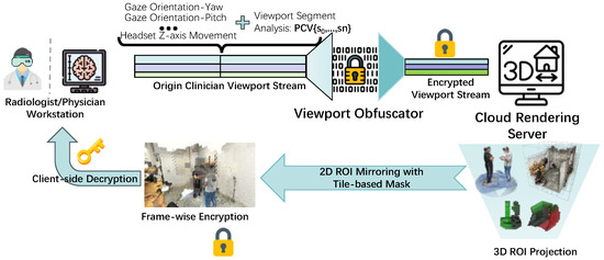 Viewport Obfuscation: In SecureTeleMed, we employ a cloud rendering architecture to transform the user’s 3D scene perception into 2D frames based on the uploaded viewport trajectory. To ensure a smooth viewing experience, the Motion-to-Photon (MTP) latency must be kept below 50 ms [16], leaving limited room for implementing protection schemes. To address this, we introduce viewport obfuscation, which selectively encrypts high-priority segments of the viewport data stream. This approach protects sensitive user data, such as clinician head and gaze movements, without compromising real-time performance.