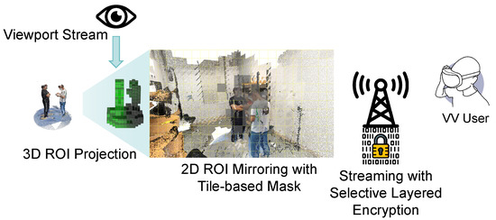 Given the high bandwidth demands and privacy concerns in volumetric video streaming, selectively encrypting parts of each frame balances privacy protection with computational efficiency. Complementing viewport obfuscation, SecureTeleMed integrates frame-wise encryption, which secures only the sensitive parts of each rendered 2D frame during the transmission process. This approach enhances privacy by encrypting areas deemed sensitive based on the user’s viewport projection and relevant content changes, ensuring efficient protection without unnecessary processing.