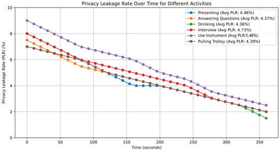 As for the privacy-preserving performance, we assess the Privacy Leakage Rate using a test video pack from the volumetric video dataset FSVVD [20] that lasts 360 s in total. The average Privacy Leakage Rate (PLR) for various activities, including ‘Presenting,’ ‘Answering Questions,’ ‘Drinking,’ and ‘Interview,’ is shown in Figure 6. Across all activities, the PLR remains below 10%, indicating effective privacy protection by SecureTeleMed. Slight variations in PLR among activities reflect different movement dynamics—for instance, more frequent head movements during ‘Answering Questions’ lead to temporarily higher sensitivity region coverage. As the experiment duration increases, user perception sensitivity scores are detected more accurately through adaptive optimization, and encryption parameters are dynamically optimized based on accumulated behavioral patterns. This refinement reduces the likelihood of missing sensitive tiles during selective encryption, thereby minimizing unnecessary exposure and contributing to a progressively lower PLR over time. The stabilization of PLR with prolonged observation further demonstrates the system’s ability to learn and adapt to individual user behavior. Overall, these results highlight SecureTeleMed’s effectiveness in maintaining low privacy leakage while supporting real-time, adaptive protection in volumetric telemedicine streaming.