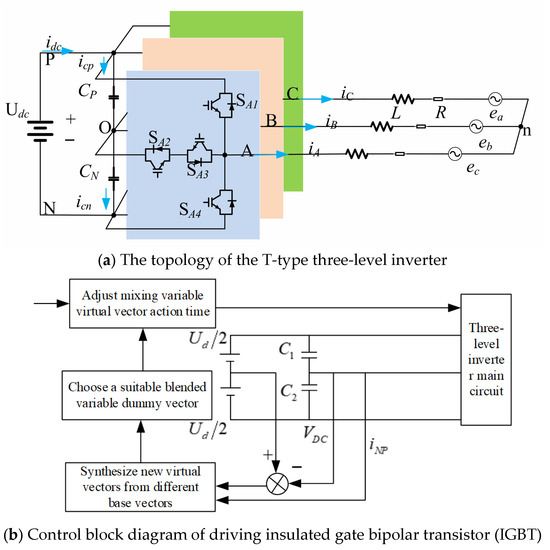 Figure 1 illustrates the topology of the T-type three-level inverter along with the control block diagram for driving the IGBTs. Each phase consists of four power switches, enabling the bridge arm to produce three distinct voltage levels. Specifically, when switches Sa1 and Sa2 are on, the output voltage is Udc/2 (the P state); when Sa2 and Sa3 are on, the output voltage is 0 (the O state); and when Sa3 and Sa4 are on, the output voltage is −Udc/2 (the N state). The on/off states of these four power switches determine both the output phase voltage and the overall switching state.