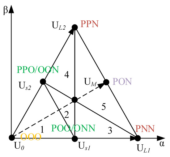 The CMV of the synthesized hybrid variable virtual medium vectors from the fundamental vectors UPNO, UPON, and UOPN is zero. As a result, the CMV of the synthesized hybrid variable virtual medium vector is zero. The fundamental vectors for synthesizing the hybrid variable virtual medium vectors in each sector are listed in Table 3. The definitions of the virtual zero vector and the virtual large vectors and are the same as the definitions of traditional virtual space vectors.